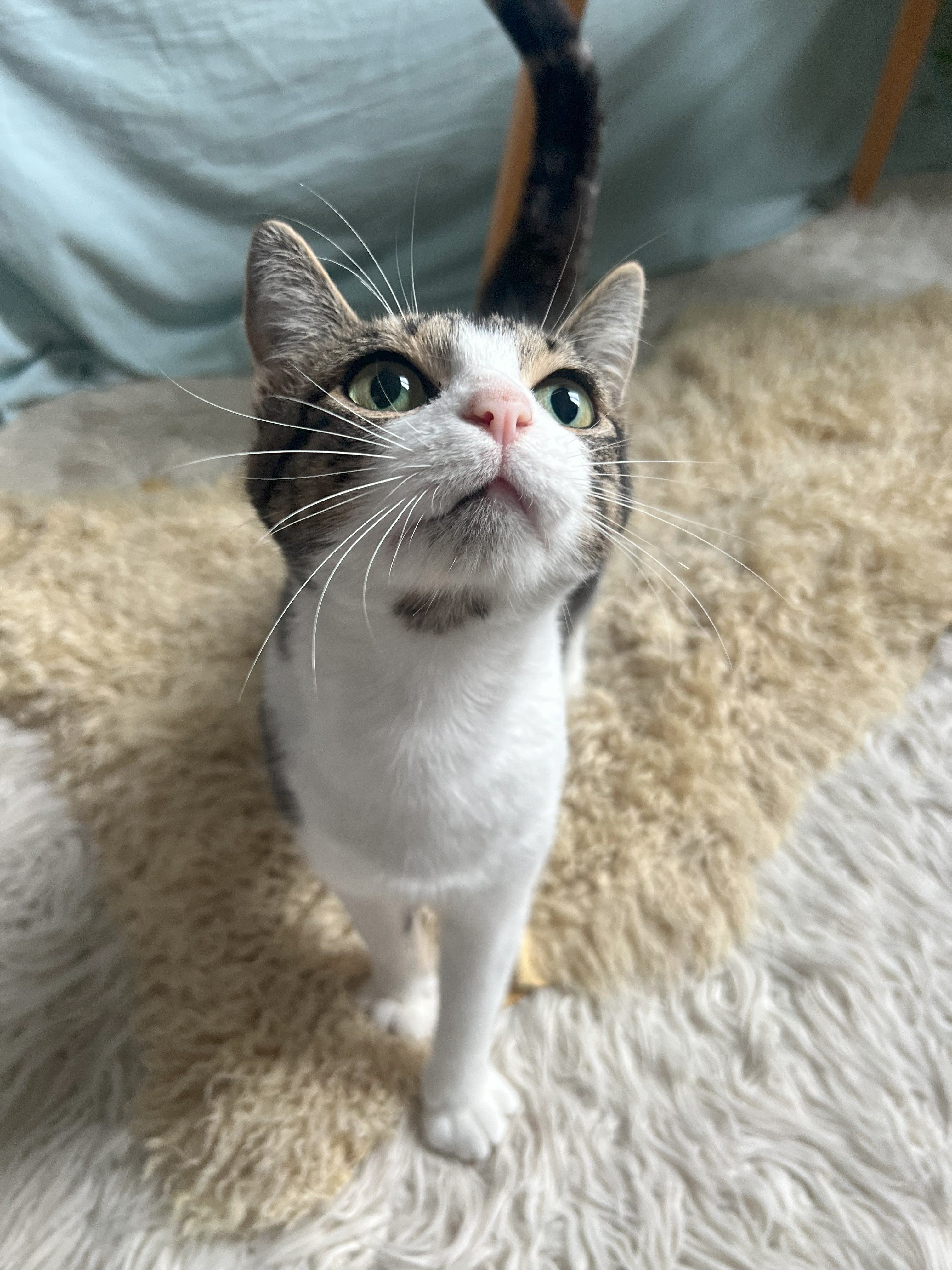 Son caractère ? Un mélange parfait d’affection, de jeu et de douceur. Affectueuse : elle adore les câlins et viendra souvent se blottir contre vous pour des moments de tendresse. Joueuse : elle aime s’amuser avec des balles, des plumeaux ou des jouets interactifs, Gourmande (mais propre si on lui donne la litière qui lui convient !) : c'est une fine gourmette qui apprécie les bonnes croquettes et les petites friandises.