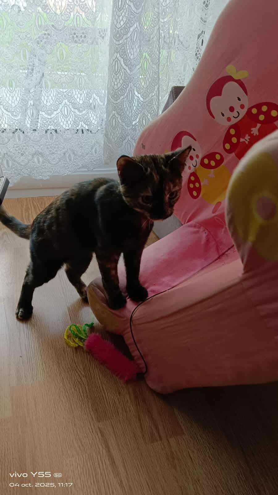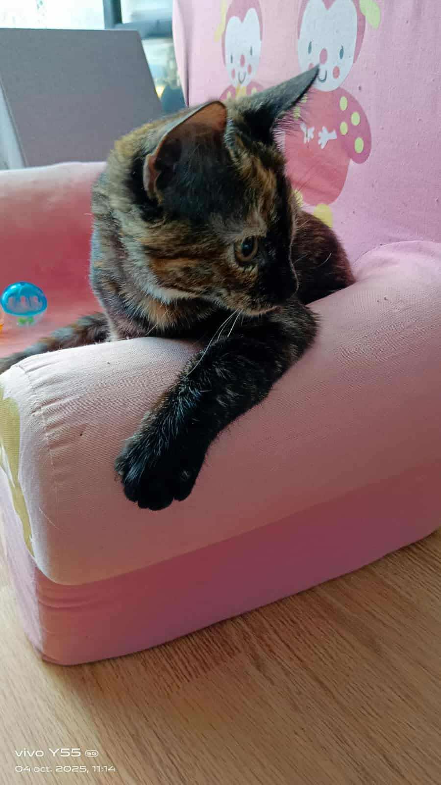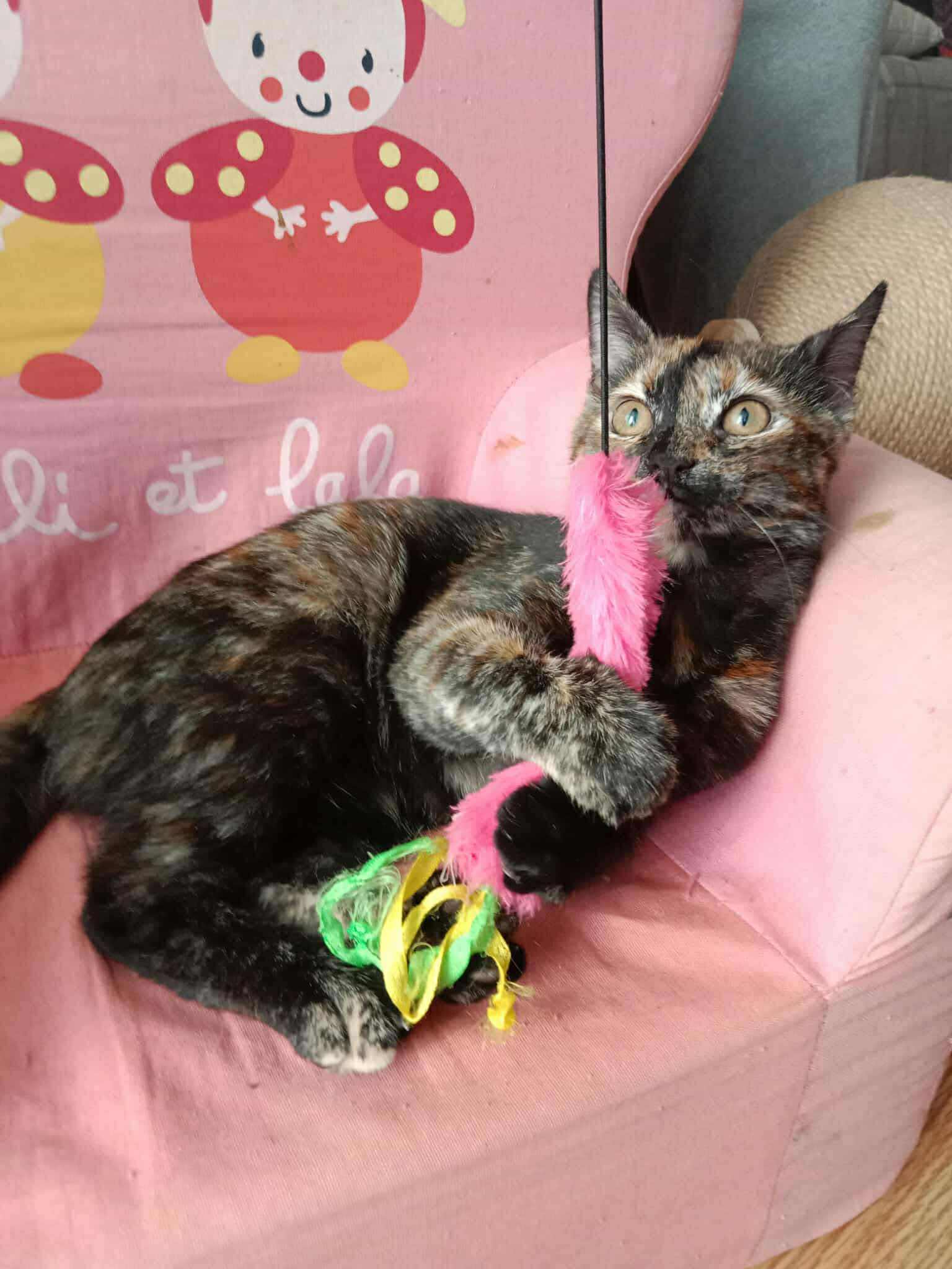 Aria est une chatonne à la jolie robe écaille de tortue. Elle fait partie d’une fratrie de 4 chatons orphelins.