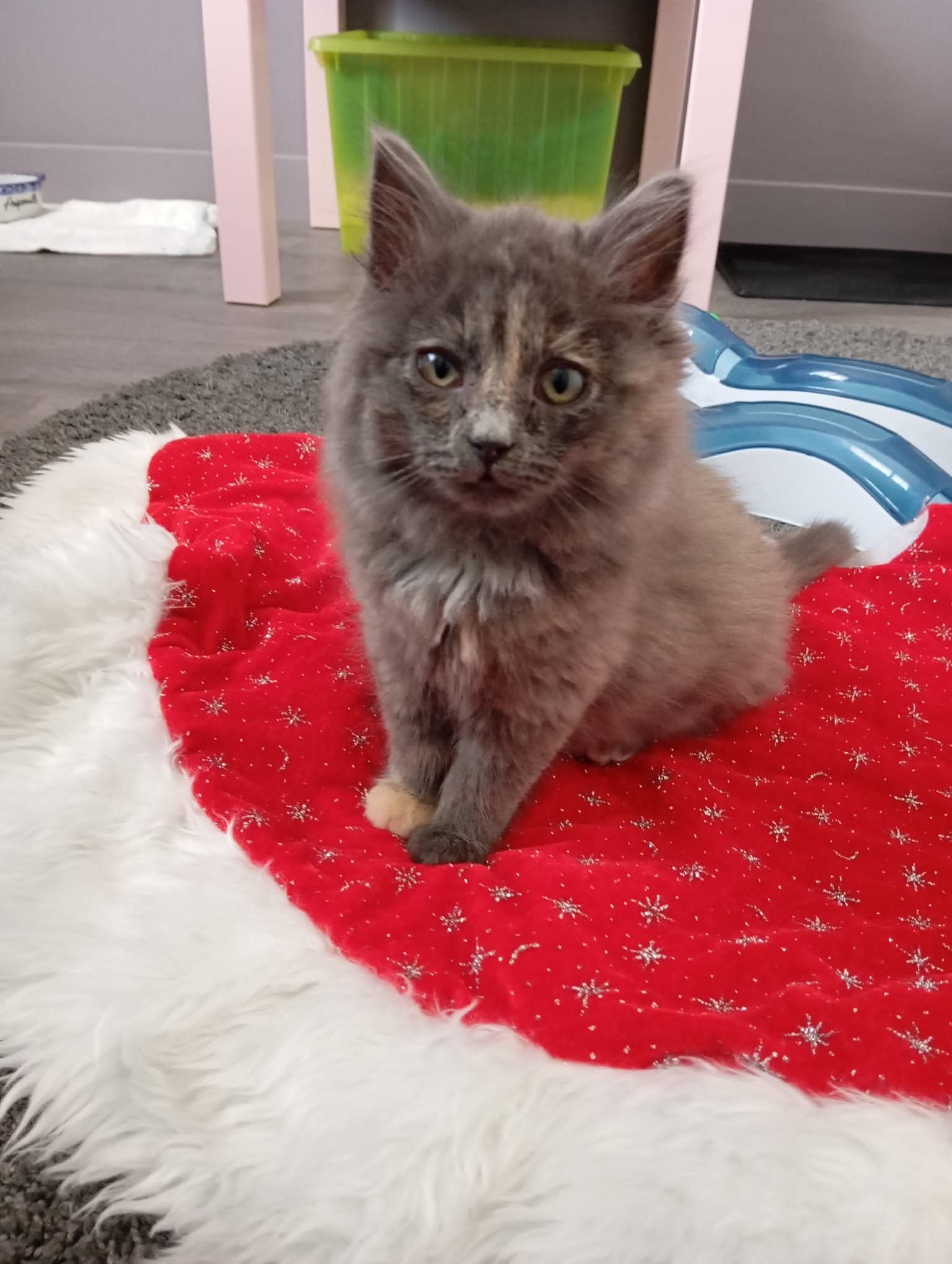 Biscotte est une adorable chatonne grise et beige à poils longs, âgée de 3 mois. Elle grandit aux côtés de sa sœur Cracotte, ce qui lui a permis de devenir une petite minette bien dans ses coussinets, équilibrée et très sociable.