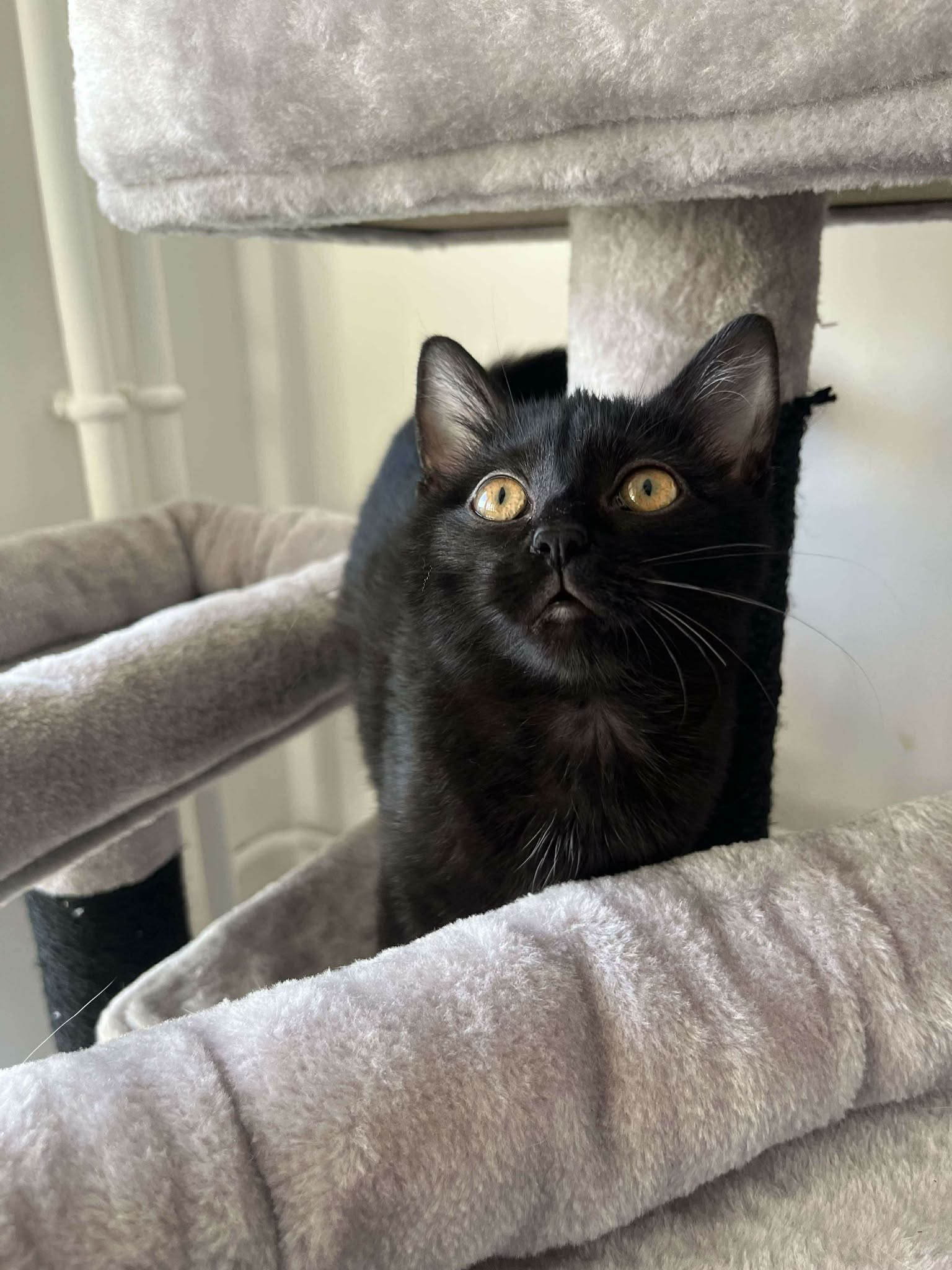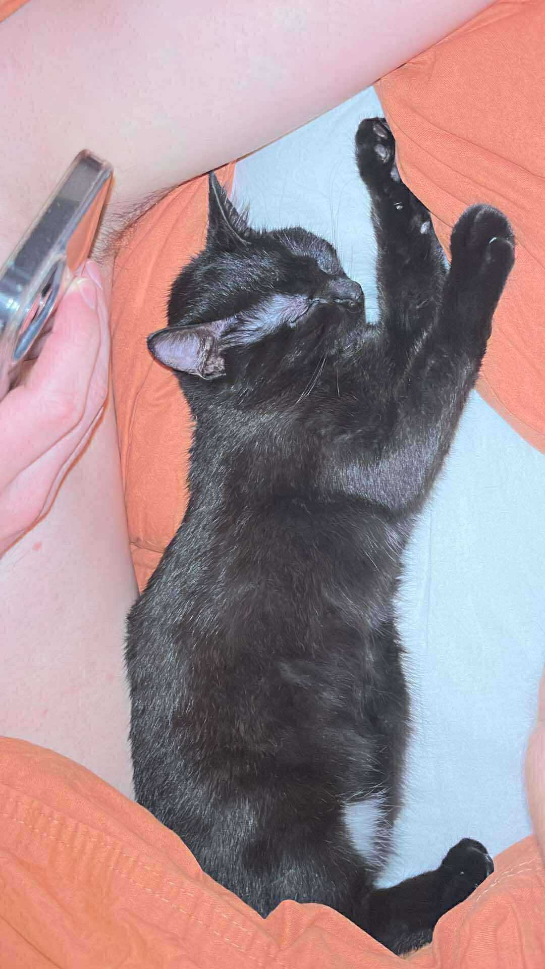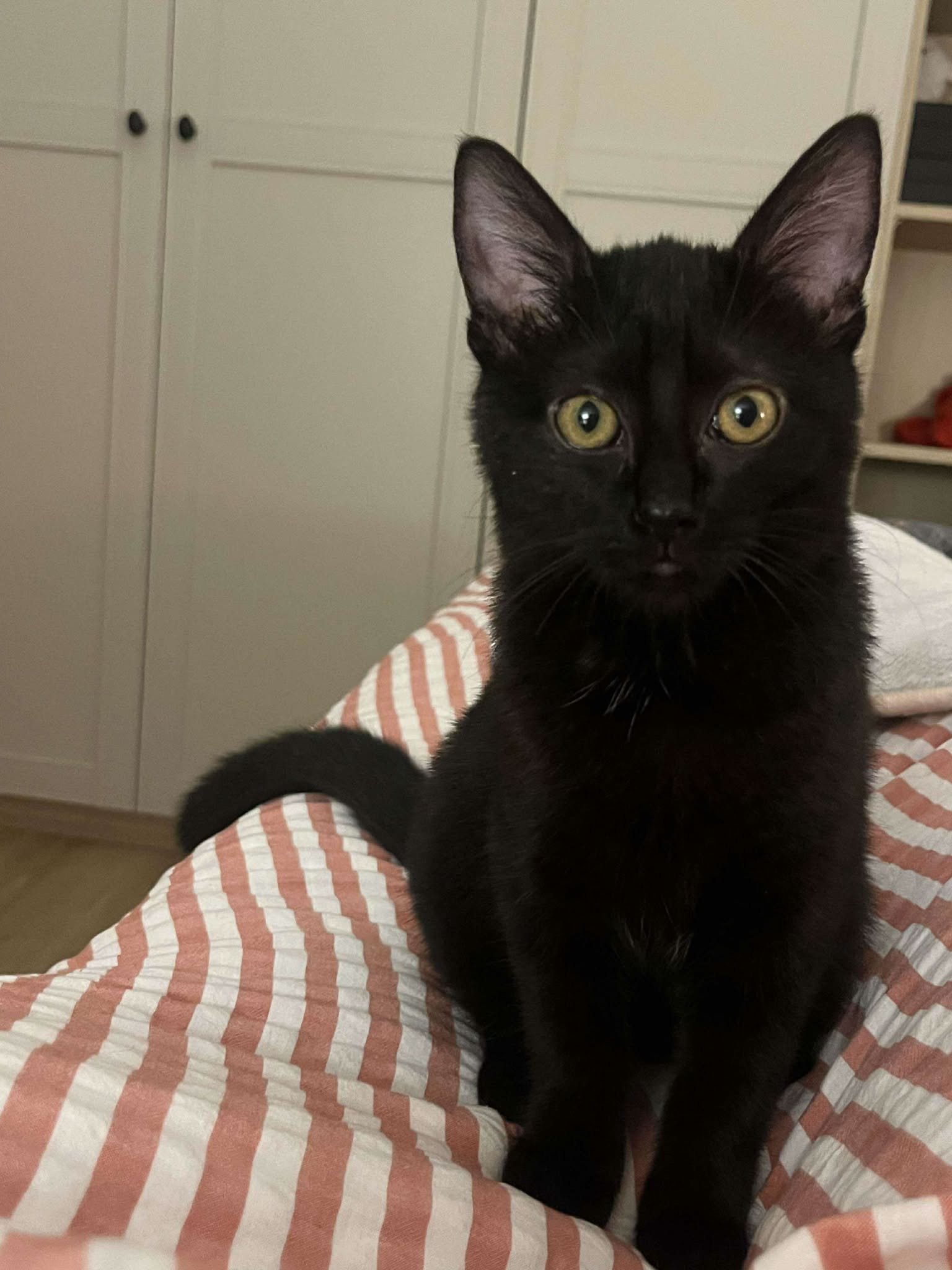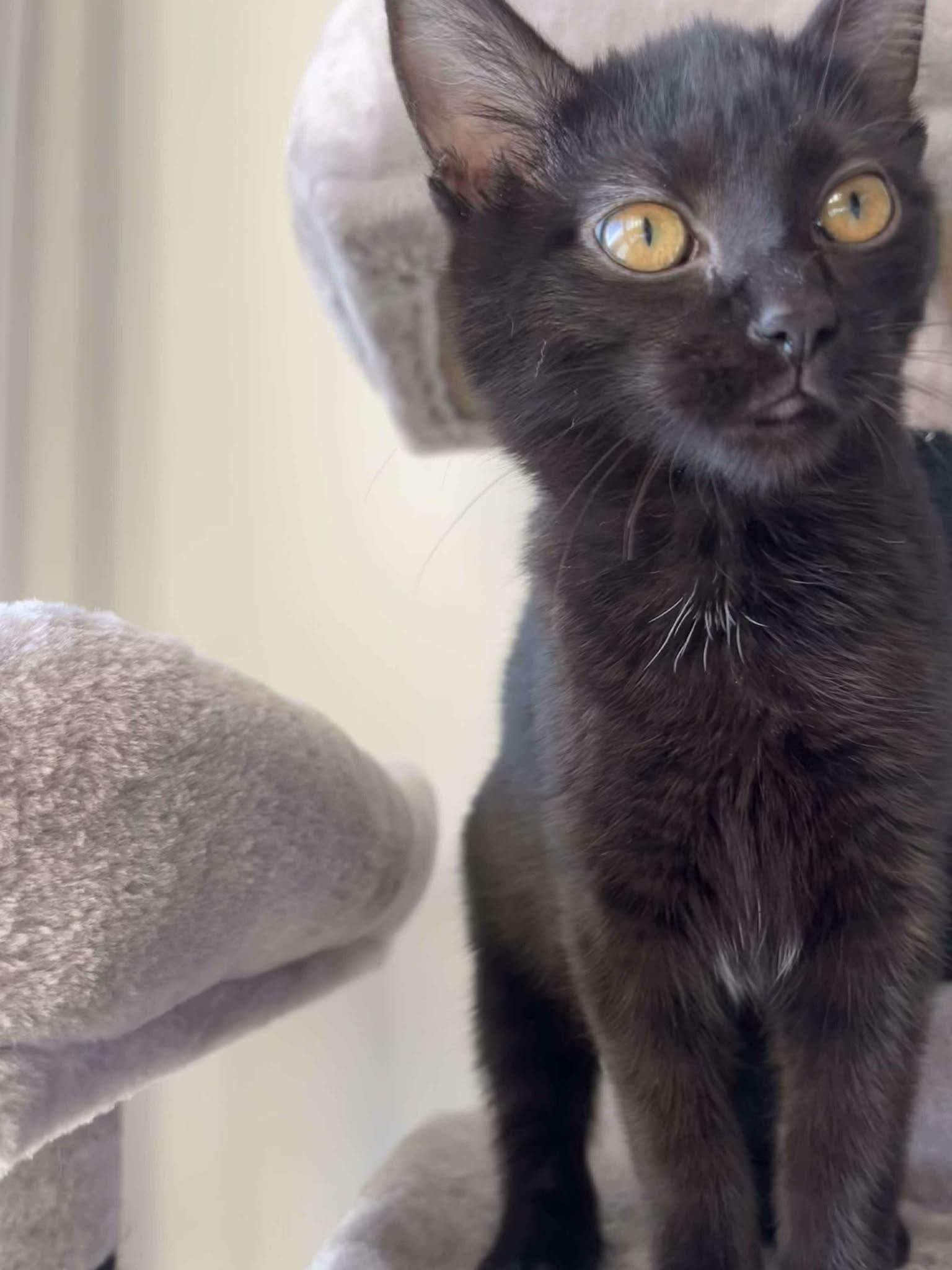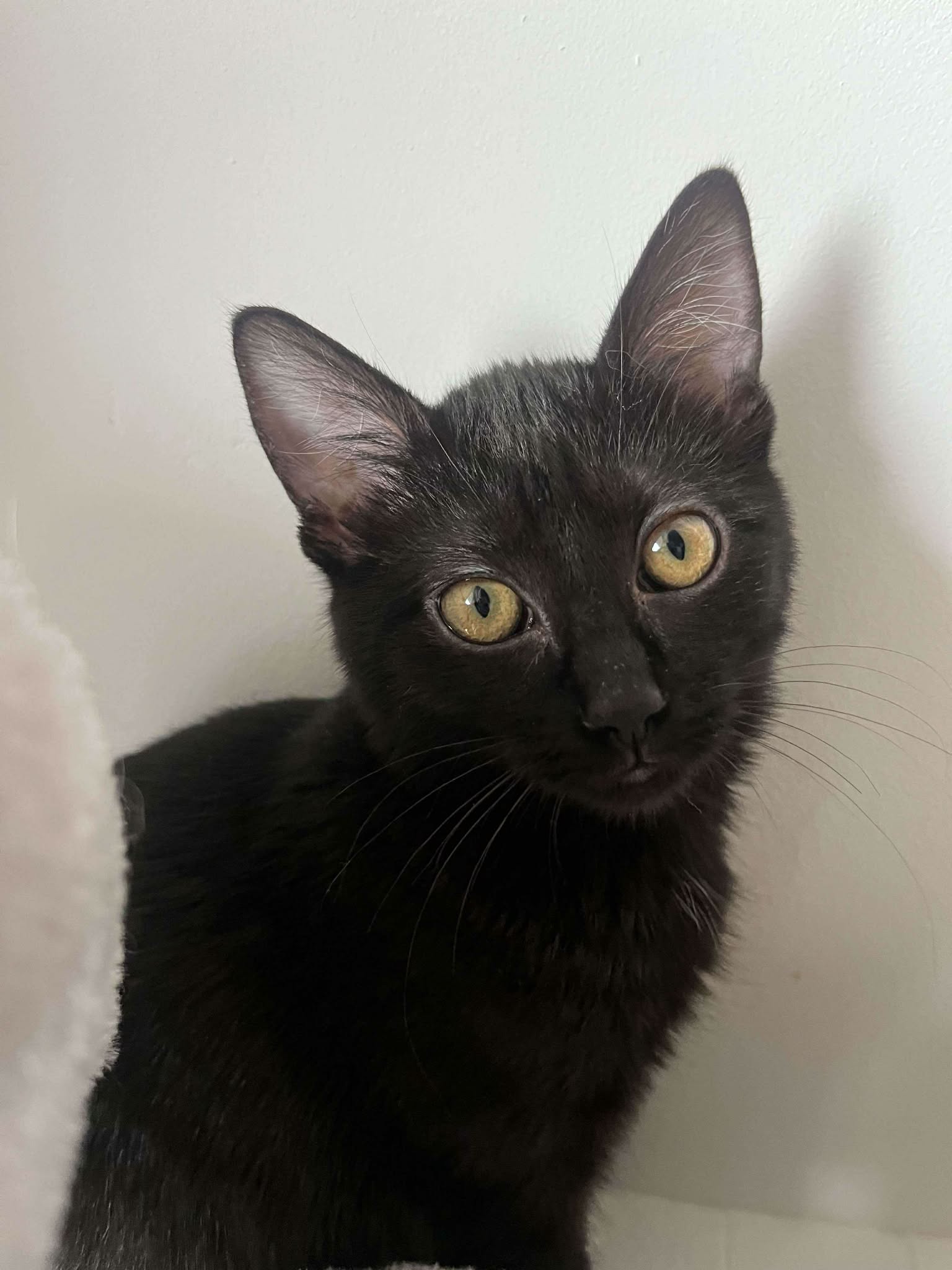 Bretzel est une petite femelle au pelage noir et aux grands yeux oranges.