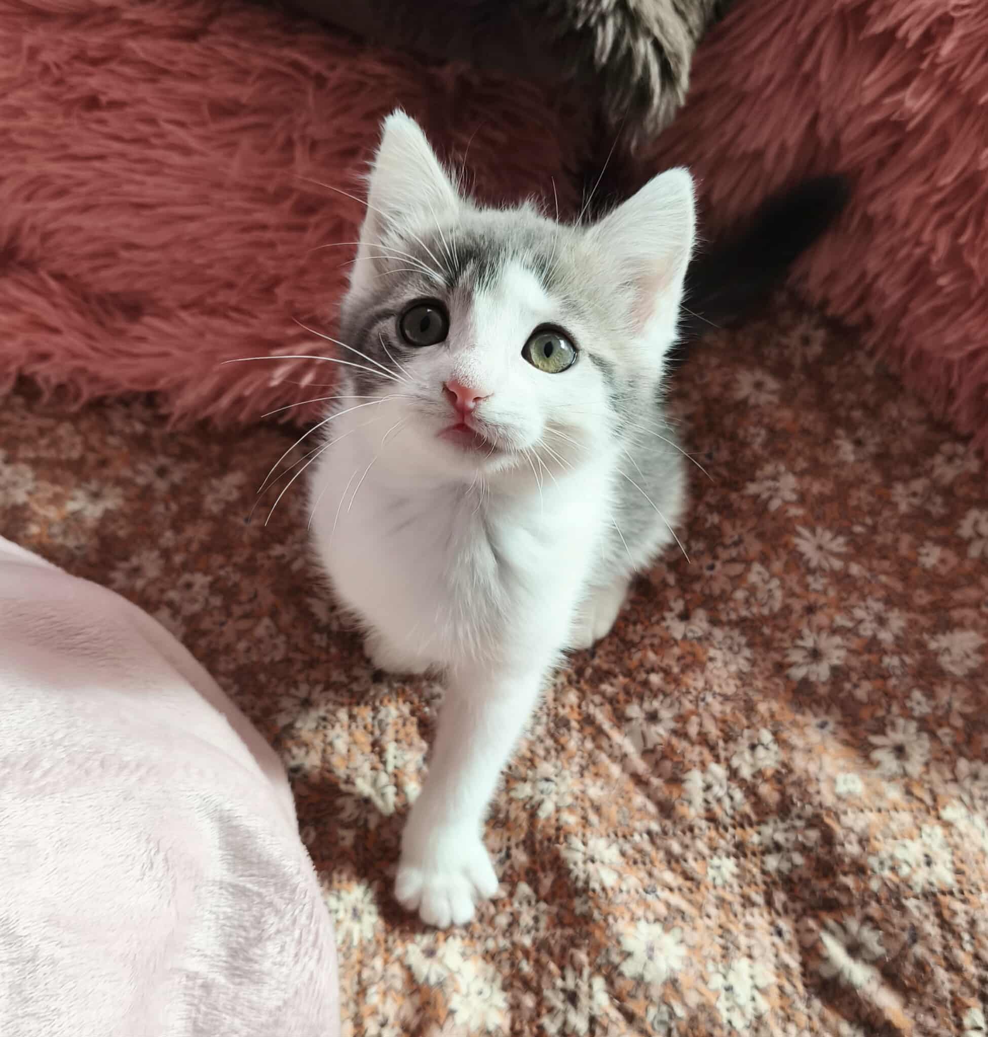 Glue est une minette adorable, câline, curieuse et très attachée à l’humain, parfaite pour une famille qui a déjà un compagnon sur place.