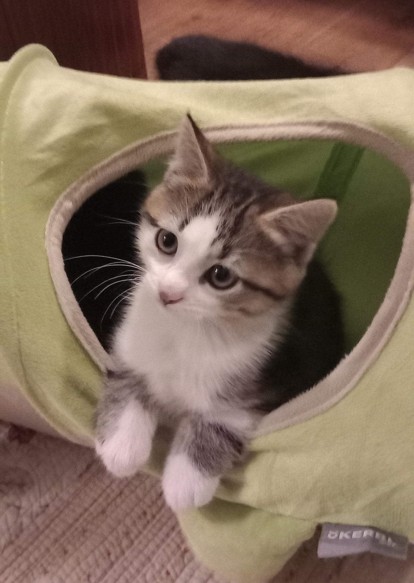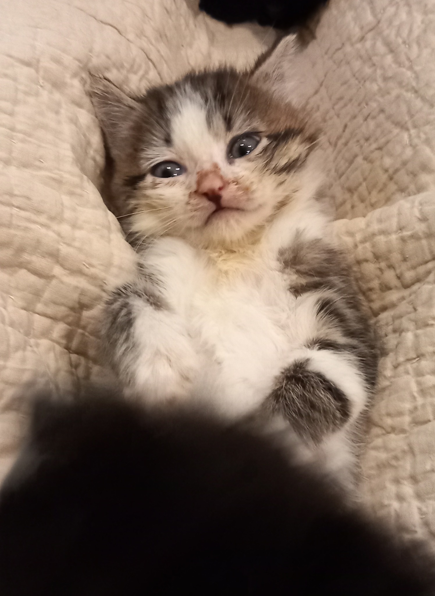 Prosper est issu d'une fratrie de quatre chatons. Son pelage doux est blanc et tigré.