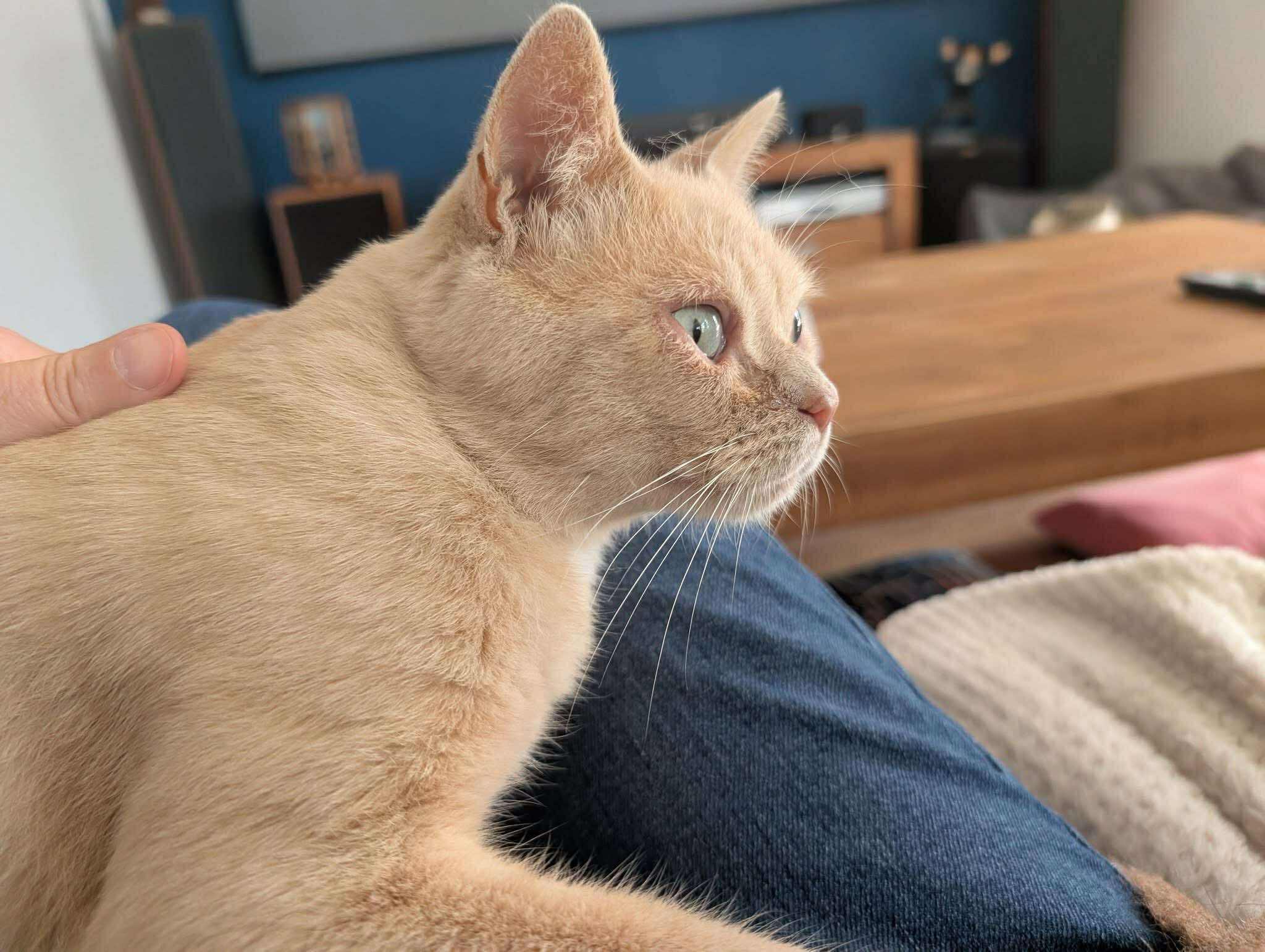 Il est très à l'aise, pas du tout craintif, et assez curieux. Il est même à l'aise avec notre chienne (un berger blanc suisse). Côté chat, monsieur préférait être le seul roi de son royaume, ses rencontres félines n’ayant pour l’instant pas été couronnées de succès.