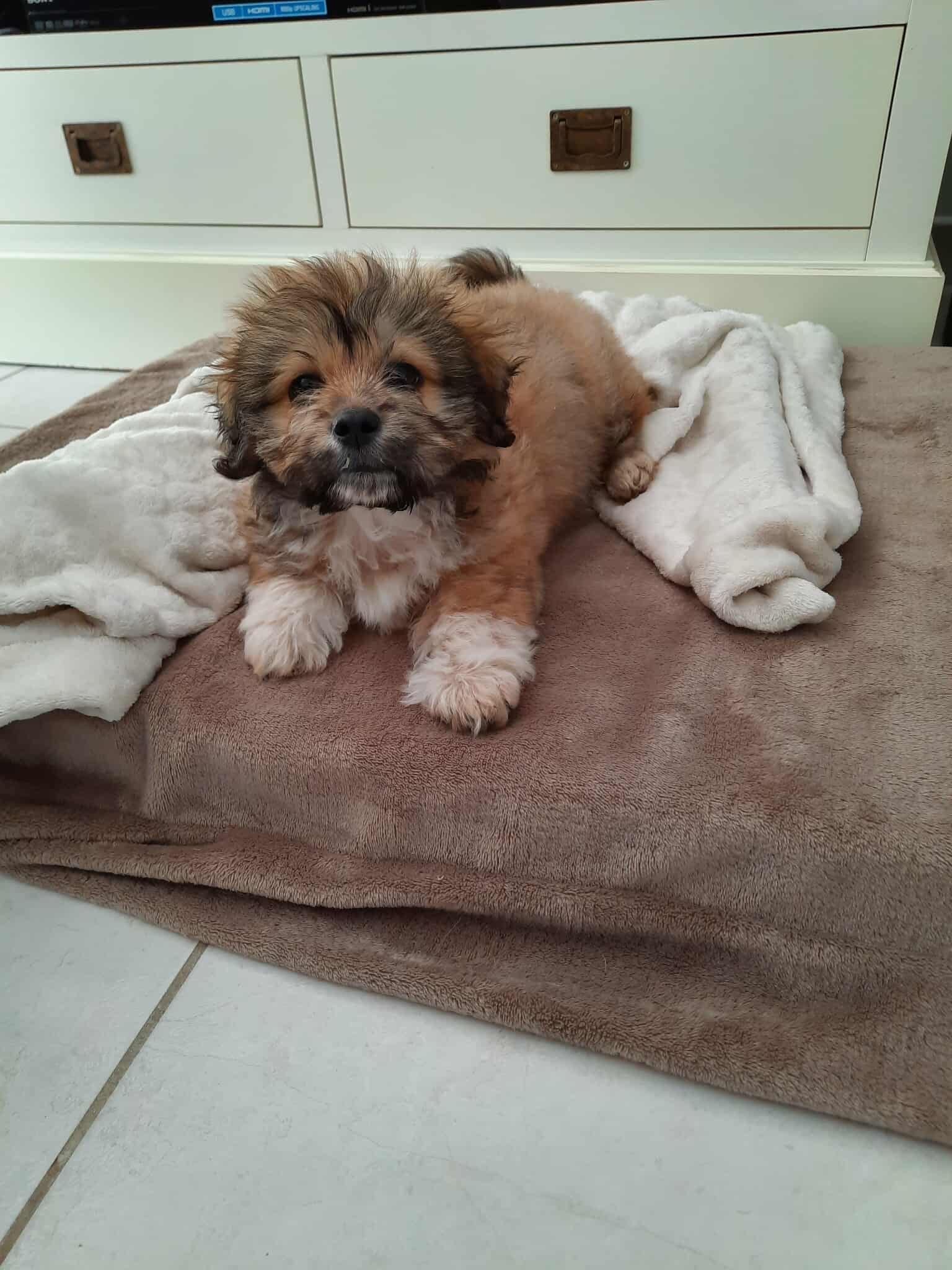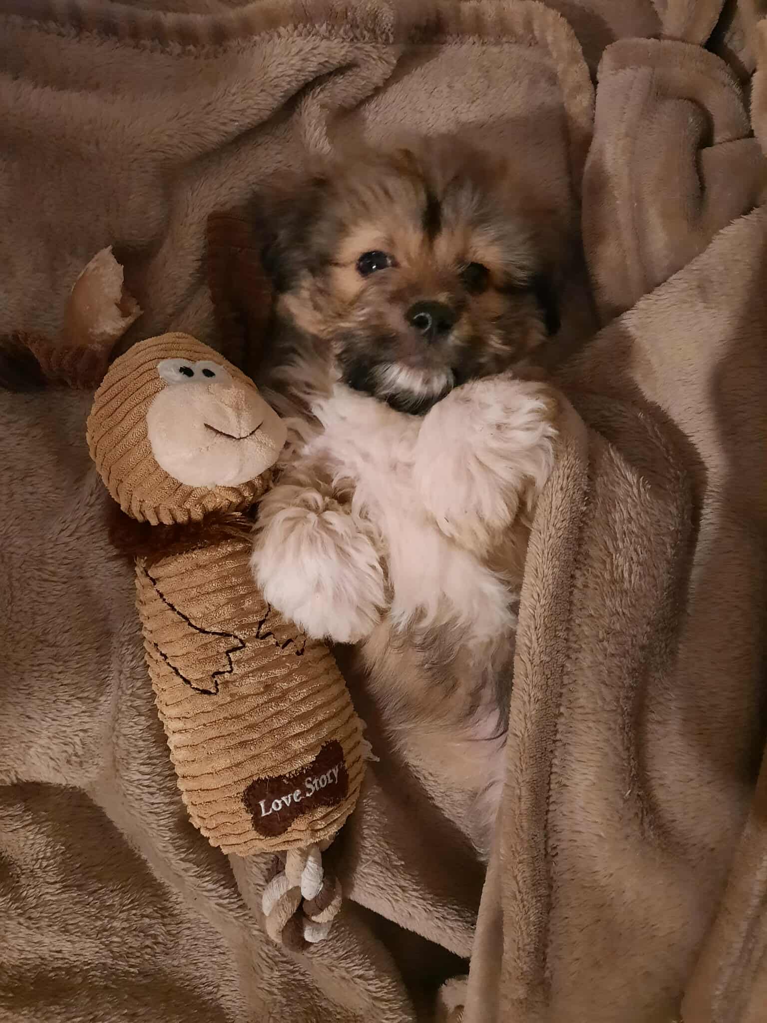 Plume est un adorable chiot mâle âgé de 8 semaines. Sa race exacte n’est pas connue (peut-être un croisé Lhassa Apso ?), mais une chose est sûre : il restera un chien de petite taille.