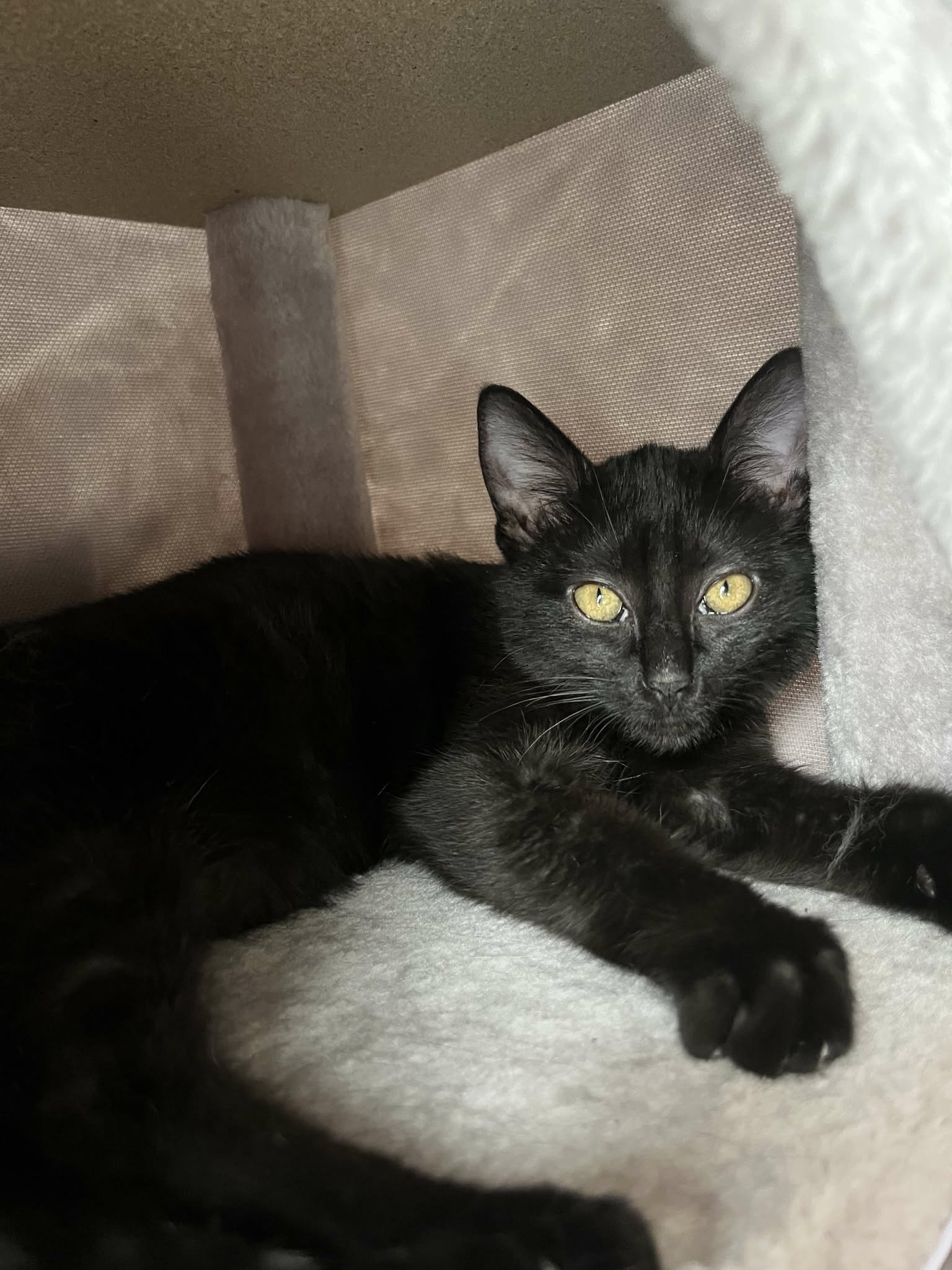 Bretzel est une petite femelle au pelage noir et aux grands yeux oranges.
