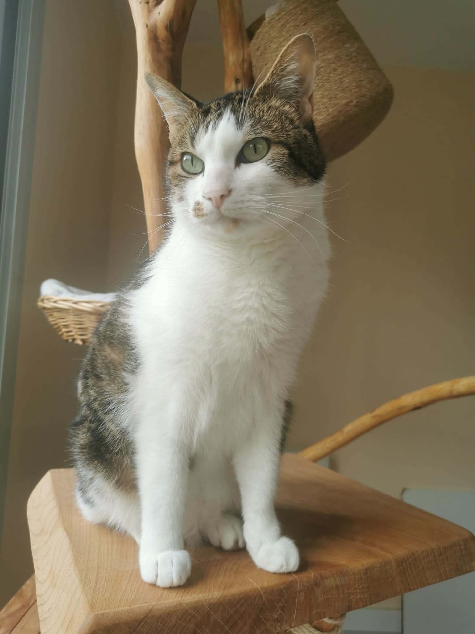Avec des moments de jeu quotidiens et un environnement adapté (griffoirs, arbre à chat), il sera un compagnon parfaitement équilibré. Il conviendra parfaitement à des adoptants souhaitant un chat proche d'eux. Nous ne connaissons cependant pas ses entente avec ses congénères ni les chiens.