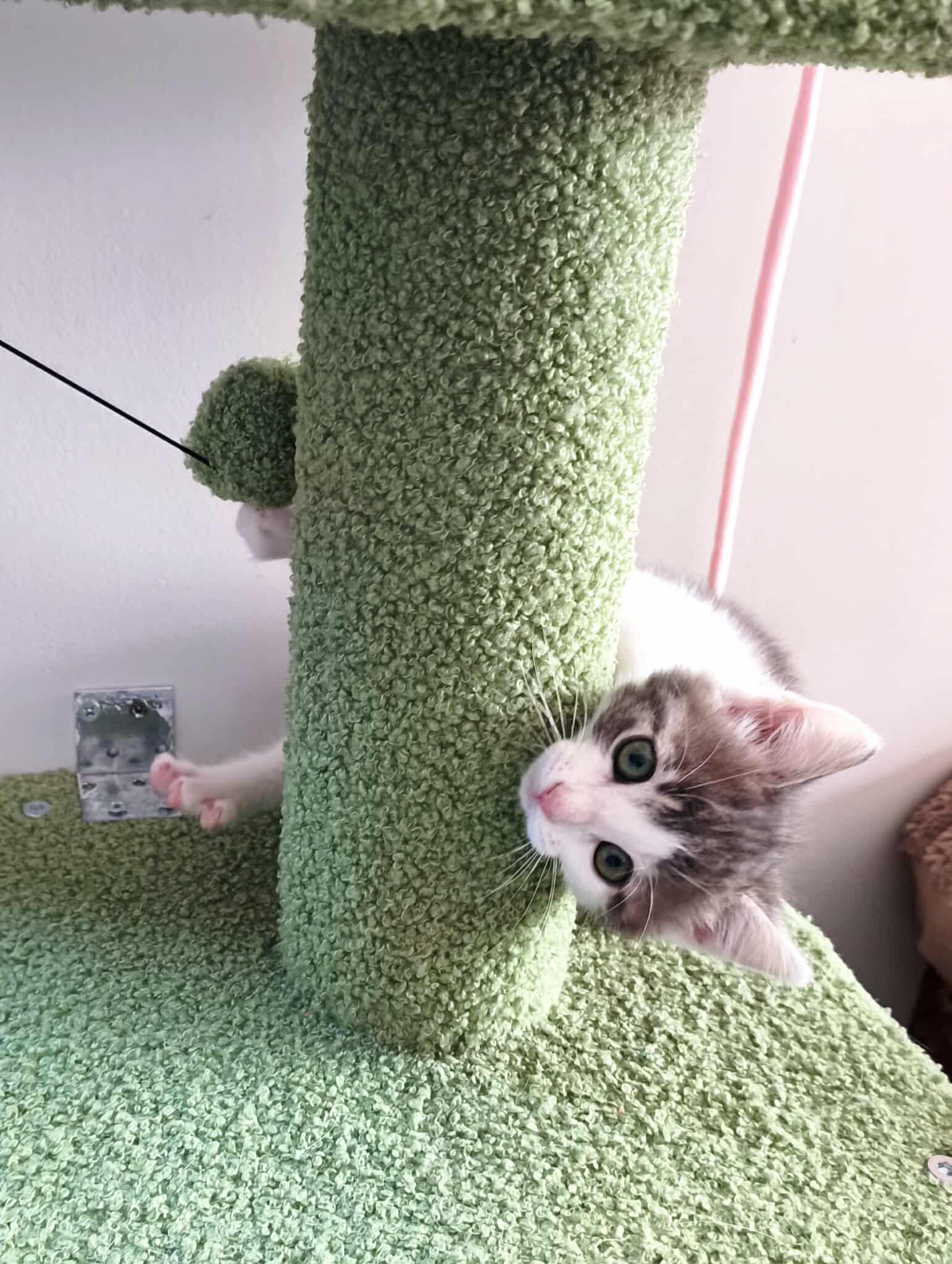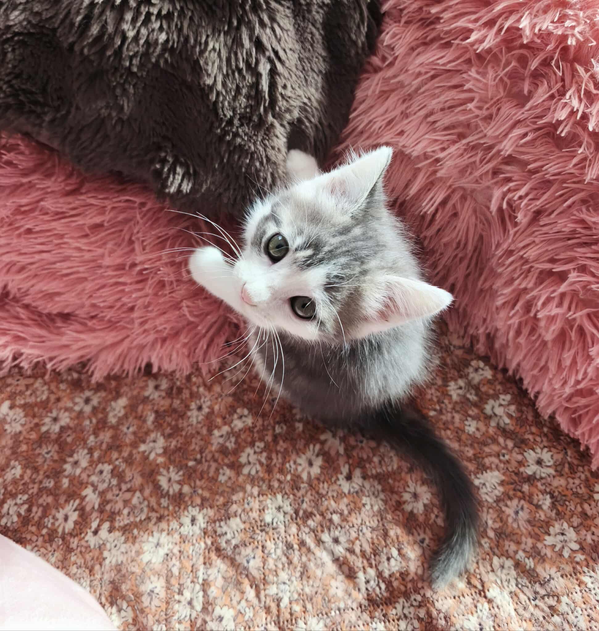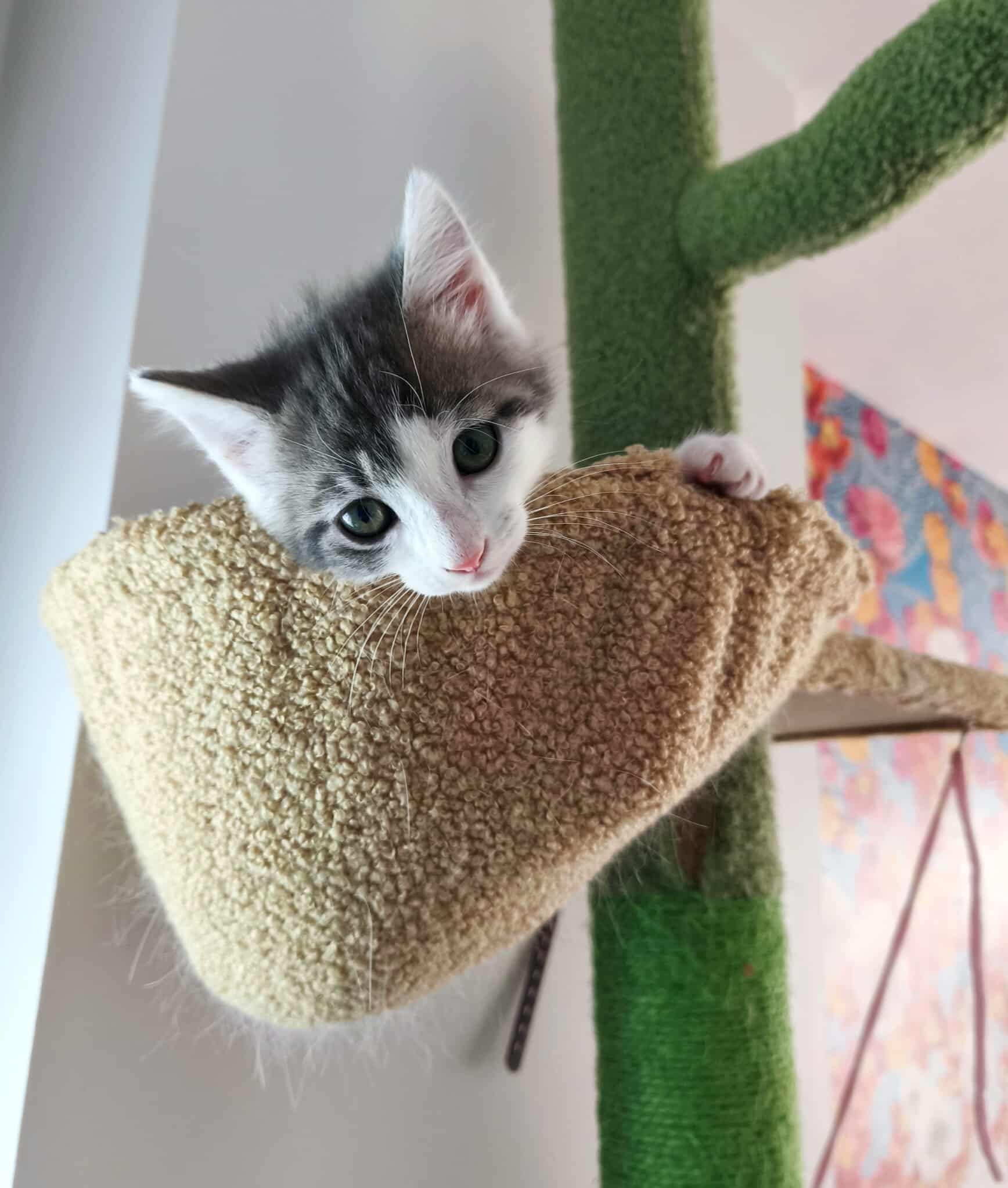 Glue est une minette adorable, câline, curieuse et très attachée à l’humain, parfaite pour une famille qui a déjà un compagnon sur place.