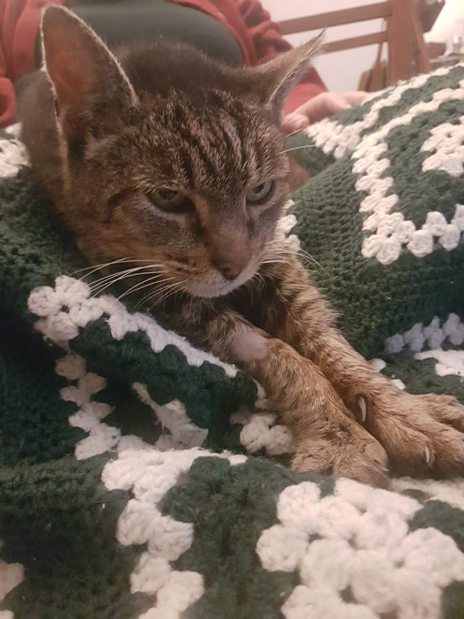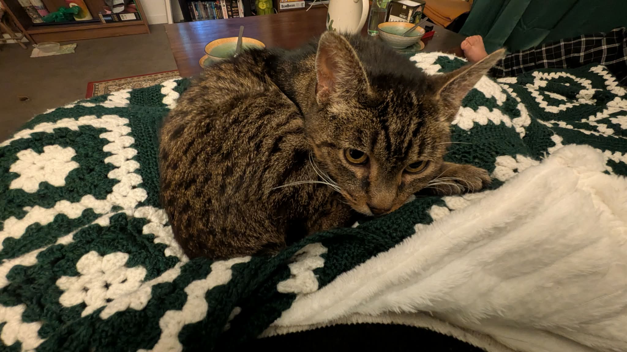 Il adore être sur les genoux, pas le temps de bien positionner le plaid qu'il est déjà monté.