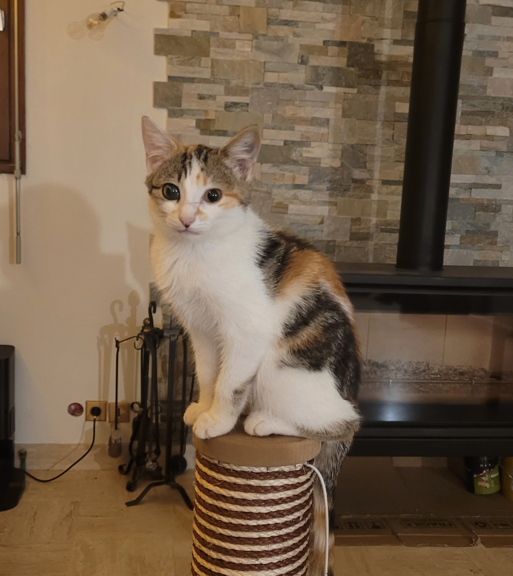 Arrivée apeurée à la maison il ne lui a pas fallu plus de 2 jours pour commencer à nous faire des câlins. Avec sa petite cicatrice sur le museau ça lui donne un air de baroudeuse ! Elle est très proche de l'humain et aime raconter sa journée quand un humain vient la voir tout en se blottissant sur les genoux.