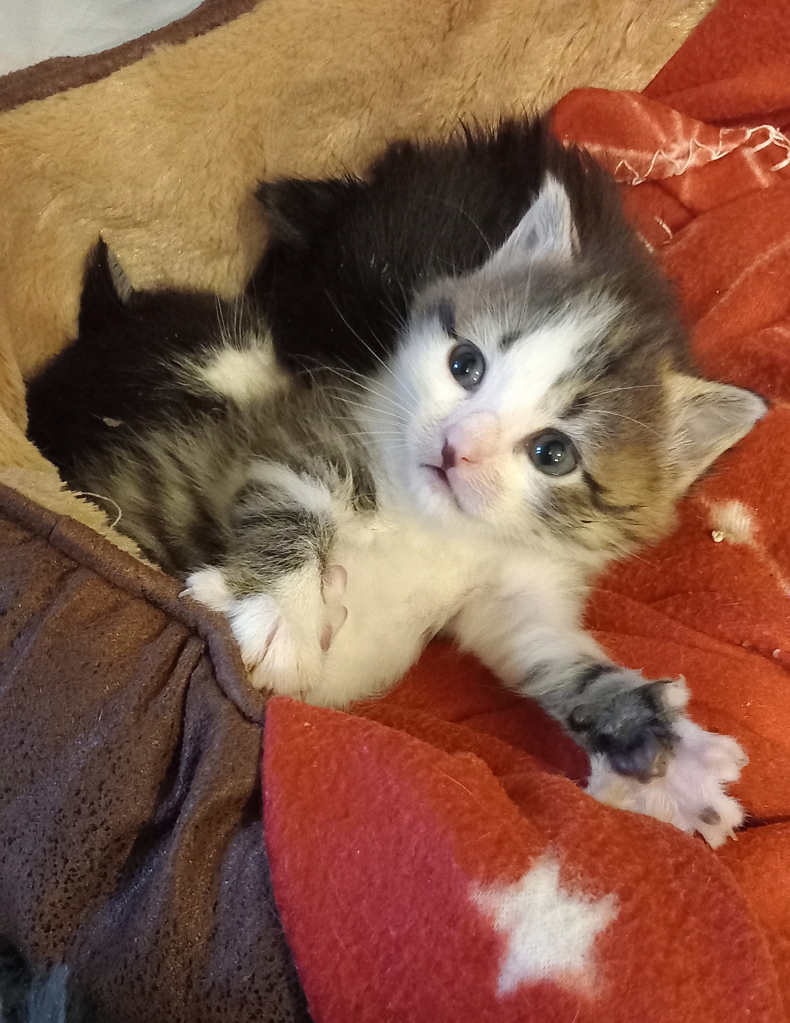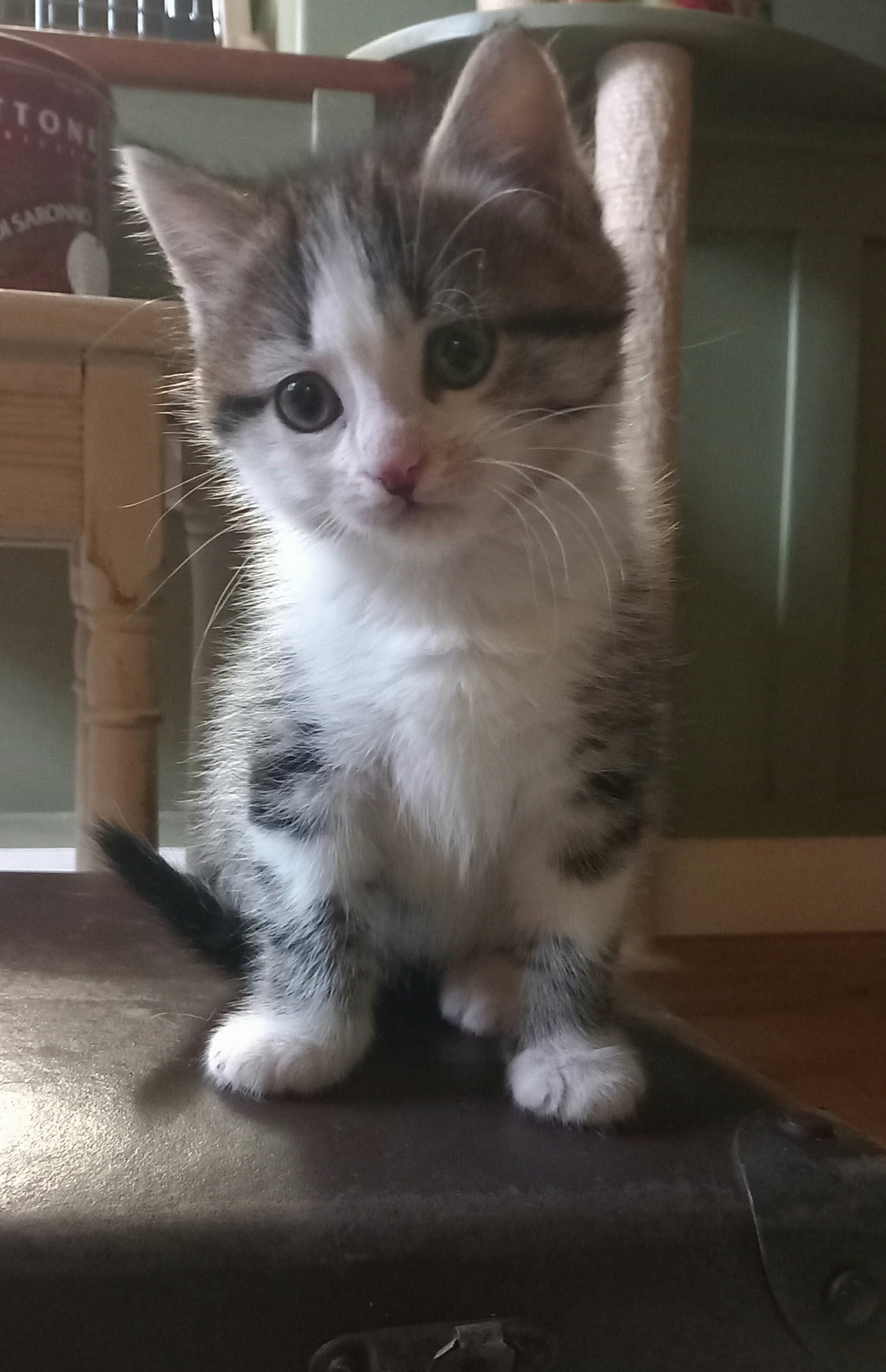 Prosper est issu d'une fratrie de quatre chatons. Son pelage doux est blanc et tigré.